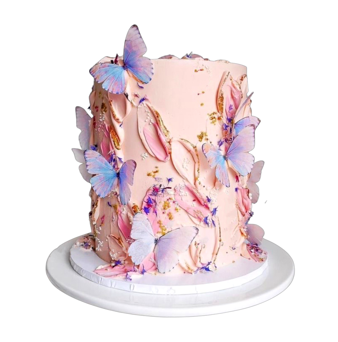 An elegant floral smudge cake design with butterflies. Comes in 3 different icing base colours white iced, light pink or light blue. Suitable for baby showers, birthdays and other celebrations.
