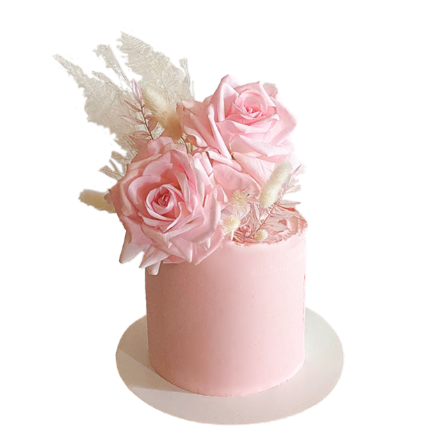 An elegant light pink buttercream iced cake, decorated with light pink roses and boho inspired leaves.