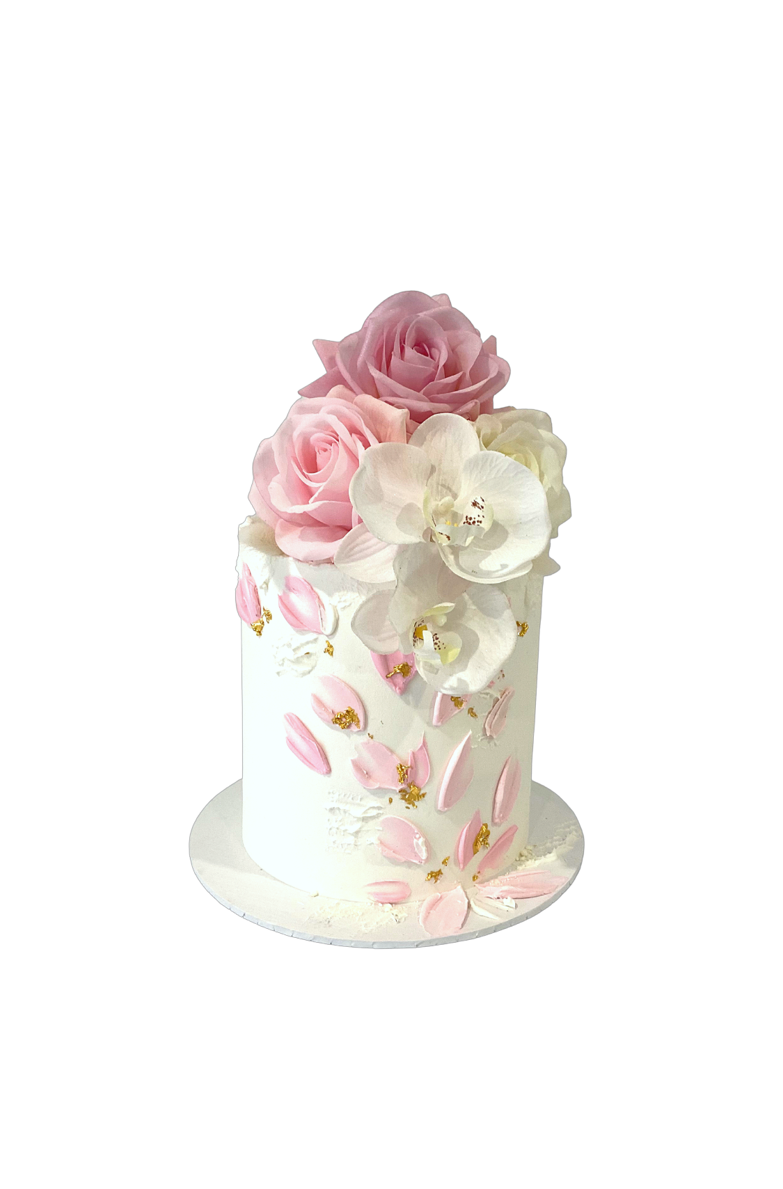 A beautiful light pink iced cake, elegantly decorated with pink and white roses, orchids and finished off with a gold leaf.