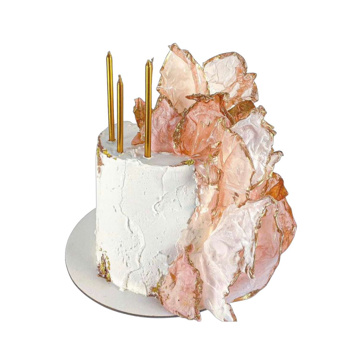 An elegant textured white cake design with translucent shards Comes in 3 different shard colours on a white iced cake and outlined in gold