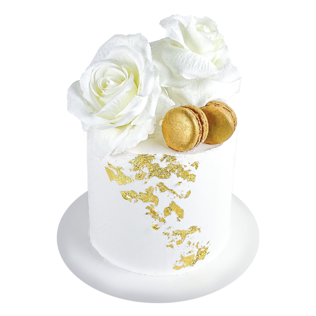 White buttercream iced cake decorated with gold leaf, white roses and macaroons.